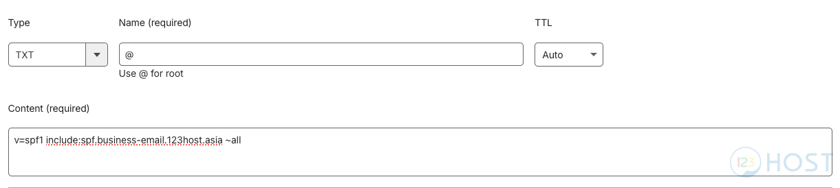 - Trỏ bản ghi TXT @ với giá trị là: “v=spf1 include:spf.business-email.123host.asia ~all”